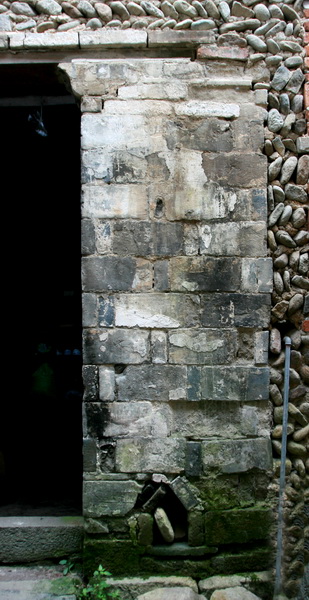 余海林老人指着他家厨房门左边的青砖门墙说,这堵布满机枪弹痕印的门墙就是那场激战的见证。这是一栋老房子,墙体大部分用鹅卵石垒砌,大门的两边门墙是砖墙。据说右边门墙的弹痕更多、更明显,但早已拆掉重建了。目前保存下来不过二三平方米面积的左边门墙上坑坑洼洼,可以看出有七处较大的弹痕,战斗的激烈程度由此可见一斑。余海林饱含深情地说,这堵墙也渗透了烈士的鲜血,当时牺牲的三名战士中就有一人是倒在他家门口的。