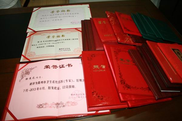 采访中,记者深深感受到了徐来元孜孜不倦的学习和钻研精神。在徐来元的办公室里,记者看到了厚厚的一叠荣誉,有省、市、县级的,还有书架上几排厚厚的医学书籍。徐来元说,活到老学到老,这些书是他最心爱的“宝贝”。