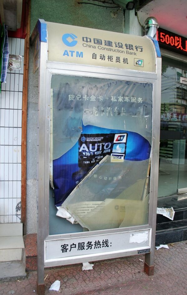 “这个自动柜员机破了好久了,真是影响城市文明建设。”8月20日下午,笔者在经过开化县城解放街108套路口时,听到一名取款的市民指着身后的自动柜员机向旁边的店主打听,外面破得这么厉害,里面的自动取款机是好的还是坏的啊?顺着该市民手指的方向,笔者看到标有中国建设银行自动柜员机字样的遮挡棚对向街头的一面,破掉了一大块玻璃,确实很难看。据旁边的居民说,这个自动柜员机已经破了好几个月了,没人修,要是小孩子顽皮,去摸破玻璃,手很容易划破的,希望有人早点来修好。
