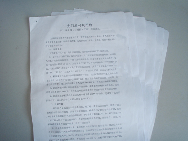 行政村规模调整后,龙门村由原汪家、余家、外山、大麦坞4个自然村组成,是一个有323户1006人的大村。早在2002年时,原汪家等4个自然村就有了《村规民约》,并在林政管理、环境卫生、规范村民行为等方面发挥过重要的作用。今年5月,为加强村民自治管理,新一届村“两委”班子上任之后,马上重新捡起《村规民约》这个“法宝”。群众提意见,村干部酝酿起草,镇党委政府把关,这个村新的《村规民约》在2011年7月1日正式“出炉”。