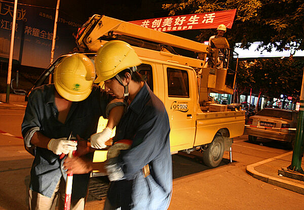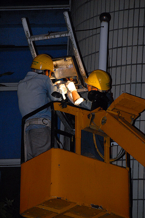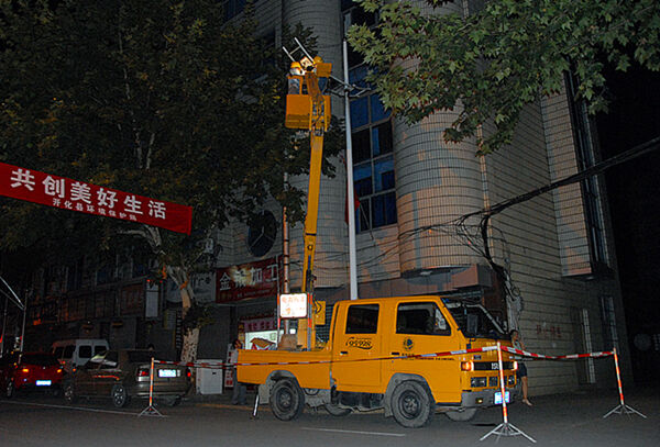 华灯初上开始沿着县城江滨路、解放街一路巡查道路两边的“盲点”, 放警示牌,设置围栏,架起吊车,断开电源,更换受损的灯头……有条不紊地医治好一盏盏“失明”的路灯。这是9月15日晚,记者跟随开化县城市路灯管理所路灯抢修小分队所看到的一小段工作场景。