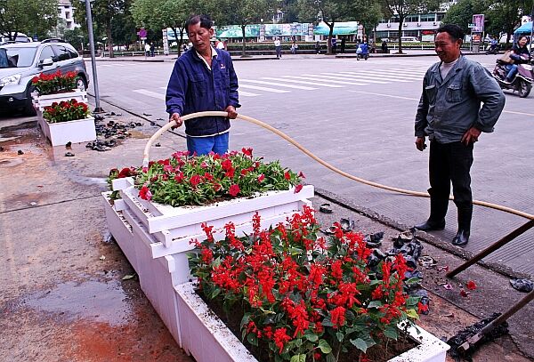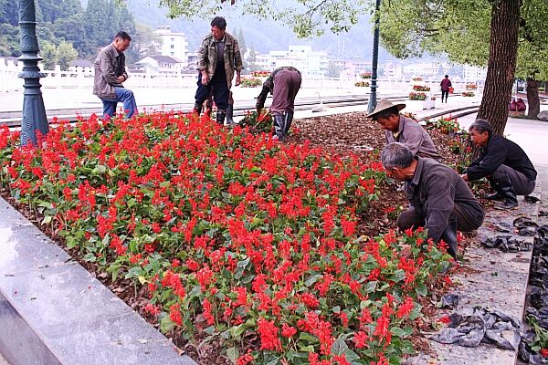 9月26日下午,记者在开化县城解放街看到,两名园林工人正在紧张忙碌地对县城主干道沿线的景观花卉进行移栽和整理。据了解,今年国庆期间,我县将有3.3万余盆鲜花在县城解放街、江滨路、芹北路、高速公路口沿线与县城荷花广场等地亮相,以此代表开化人民对祖国繁荣富强的美好祝愿,迎接中华人民共和国成立62周年。