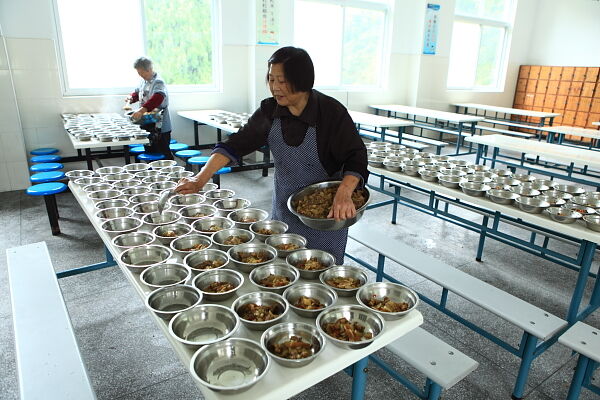 两位炊事员在给每位学生装菜