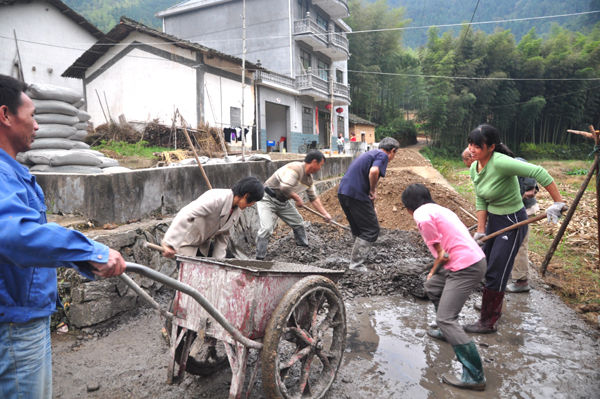 据村支书汪根茂介绍,修好村道是近年村民“一事一议”最多的话题。这些年农业产业结构调整力度大,不解决村里的交通问题,群众脱贫致富将成为一句空话。 今年该村两委把硬化村道作为5件为民办实事之一。按照2.5米宽、长800米的路面造价计算,总造价需要16多万元,面临巨大的资金缺口,村两委采取依靠上级补助、部门赞助、村民自愿投工投劳等方式筹措资金。在杨坑自然村施工现场,记者看到村民们冒着细雨,穿着雨鞋,有的推车,有的浇拌水泥……个个干劲十足,一派热火朝天的景象。许金土介绍,接下去马上要对大坝底、塘里两个自然村的道路进行硬化,11月底前全部完工。今年该村将硬化村道4000余米,总投资近100万元。