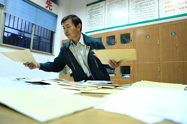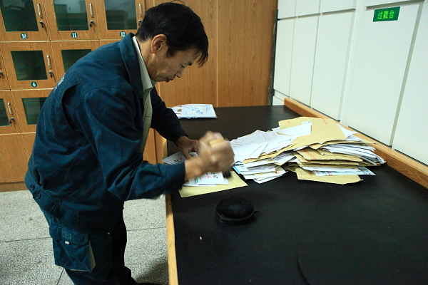 7:58,老郑最早到单位,给昨天留下的信件盖戳