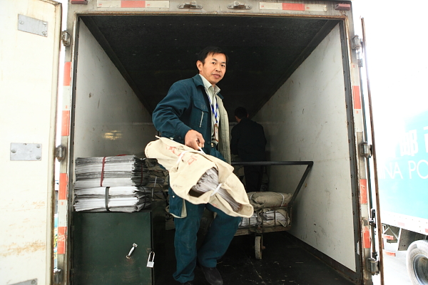 9:24,衢州来的邮车到了,老郑在卸报纸