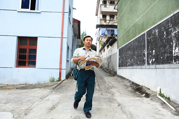 老郑是个工作勤恳的人。中午11点,老郑推着堆得像小山一样的自行车开始了一路“邮”行。伴随着清脆的铃声,老郑的“邮车”穿梭在大街小巷、单位社区,按时把邮件送到客户手中,每当看到客户拿着墨香的报纸细细欣赏时,他就快活得像个精灵。偶遇上午未投递成功的邮件,老郑还要作二次、三次投递,多次往返收件客户家中,或电话与客户约好时间,直至将信件送达至收件人手里。还有一些“地址不详”的信件,老郑更是凭着他的贴心、细心、用心,使这些邮件“起死回生”。他还坚持给行动不便的老人送报上门,一送就是11年……对此他无怨无悔,不求回报。
