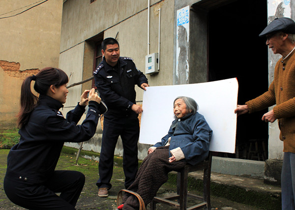 12月8日下午,开化县“群众满意基层办事窗口”的城关所办证窗口户籍民警詹玉兰,与同事专门来到城关镇罗丰村张家自然村5号徐桂秀老人家中,为她采集身份证照片,办理第二代身份证。