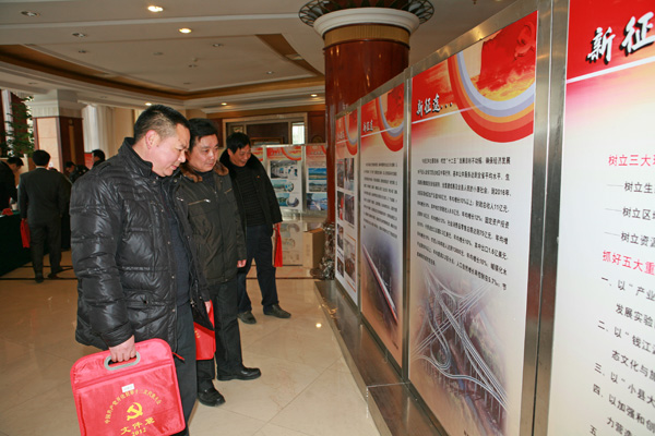 1月5号上午,参加中共开化县第十三届党代会的代表们在开化大酒店大厅观看县十二次党代会以来五年成就回顾图片展。