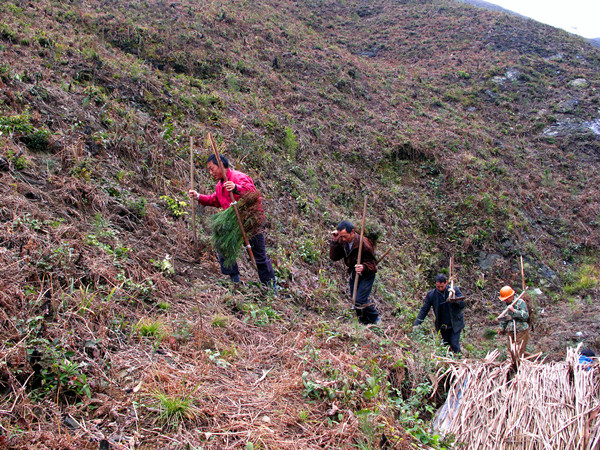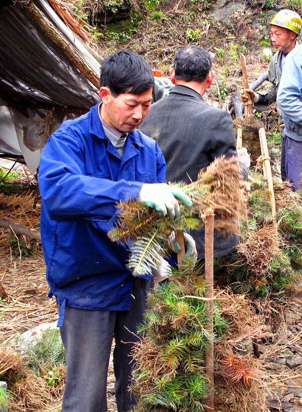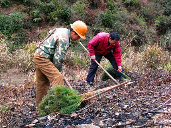 随着国家林权制度改革的推进,开化各地的不少林农如同吃了定心丸,植树造林的积极性空前高涨。2月24日一大早,记者随同开化县林业局和杨林镇林业站的工作人员走进蕉荷村,加入到了蕉坑口自然村百公坑山400亩荒山绿化的队伍中。      当天的主要任务就是种植杉木苗和松木苗,按照每亩种260株到280株的标准,给事先已经整过地的荒山披上绿装。      “要确保造林质量首先要保证苗木的质量和成活率。像我们手上现在拿到的这株湿地松,要挖深坑,按照它全长的50%深种下去。” 杨林镇林业站站长余增喜一边向记者示范植树的正确方法,一边向记者详细介绍了蕉荷村的绿化造林情况。      据余站长说,蕉荷村是由原来的蕉坑、蕉坑口、荷村三个行政村合并而成的,全村共有1300余人,山地16000余亩,不过,由于地处偏远打理不到等原因形成的荒山也很多。所以,村里近几年一直在积极流转山林,鼓励村民承包荒山,绿化造林。今天绿化的这片山,主要是由该村的村民张华荣与朋友合资成立的“开化县绿悠悠生态农业开发有限公司”运用市场化商业操作模式来实施的。从流转荒山到雇请人工开荒造林再到抚育林木,全部由公司组织安排并出资完成。      “首先一块就是解决了当地的劳动力就业问题。像绿悠悠公司今年植树期间,每一天的劳动力需求就有20多人,一年雇工超过6000余人次,社会效益还是比较可观的。”在种树休息间隙,余站长又开心地给记者算了一笔帐,“第二就是生态效益这一块,年年造林势必加快我们全镇的森林覆盖率;第三块就是老百姓自发性造林积极性得到了极大的提高,我们全镇今年的绿化造林面积将超过3000亩,占全县今年绿化造林总任务的十分之一,为我县进一步推进森林城镇建设发挥作用。”       “植树造林,既是为子孙添财造福,也是为自己积累财富,存养老钱。”听到了记者与余站长的谈话,走过来补充苗木的绿悠悠生态农业开发有限公司的股东之一、开化主要负责人张华荣笑着接过话茬,“其实,在我们农村里,相对来说大家都感觉植树造林这一块回报率很高。只要有经济能力的,都想来投资这个。大家都会算这个账,我们现在投资造林一棵杉树,每年获得的回报是2元钱一棵的利润。像我公司,一共是流转了1100多亩荒山,平均每亩将近300株,稍微毛算一下,到20年以后,我这片杉树就将产生近1000万元的毛利润了!”