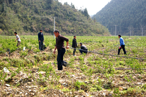 3月22日,开化县桐村镇黄石村的山垄田里呈现一派火热的劳动场景:十多位村民在这里精心培育金银花,装喷微管、挖坑、施肥,大家在有条不紊地忙着手中的农活。“这些金银花都是老板朱友敢投资的,我们帮忙料理。”村民们高兴地说。