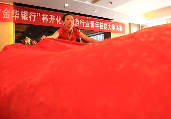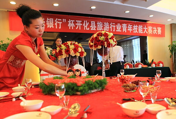 2012年开化县旅游行业青年技能大赛拉开帷幕。4月27日,记者在衢州东方大酒店开化分店看到,来自开化县的六家餐饮企业正在进行餐厅服务技能大赛。赛场上,参赛选手认真细致,一丝不苟;赛场下,前来观战的同事给选手们加油鼓劲。