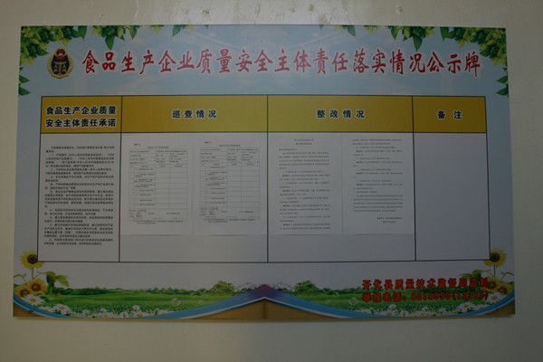 公示牌由县质监局按统一规格统一制作和安装的,张挂于企业显著位置。公示牌上主要包括三个部分内容:第一部分为质量安全主体责任承诺公示,要求企业按照省质监局对食品生产企业集体约谈工作的要求,面向社会公开承诺企业保障食品质量安全需履行的义务;第二部分为巡查情况公示,张贴日常巡查、专项行动中向企业发出的责令整改通知书、监管巡查表等文书;第三部分为企业整改情况汇报公示,公布企业整改情况。通过公示不仅使有关主管部门对食品生产企业监管阳光操作、公开透明,还能使监管工作起到更好的效果。