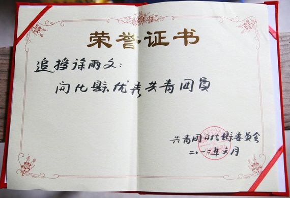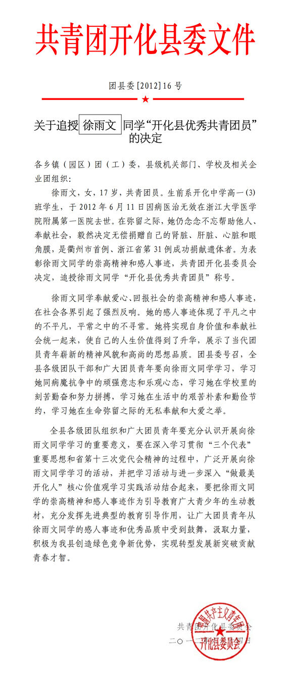 共青团开化县委追授徐雨文同学为“开化县优秀共青团员”