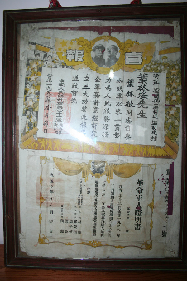 如果仅仅从老叶现在的生活状态和样貌上来猜测的话,你很难把眼前这位高高绾着裤腿,穿着解放鞋的清瘦老人与战争年代为了党的革命事业,不畏血雨腥风,激情奋战的革命军人联系起来。可是,历史就是历史,就像老叶身后用红木相框装裱起来的一张“朱毛”头像喜报和另一张革命军人证明书一样,尽管默默,却依然醒目。