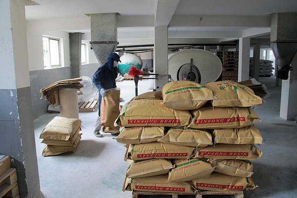 8月13日,记者在浙江鑫松树脂有限公司仓库里看到,工人们正忙着在车间里包装产品。公司总经理程永洋相告,这批松香树脂S7110是准备发往深圳和上海的。公司产品目前销售行情不错。