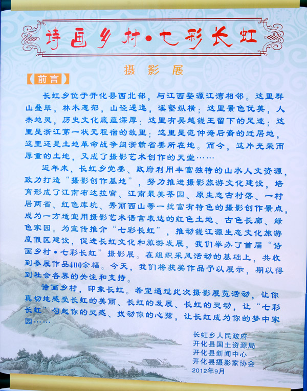 9月15日上午,在中国(衢州)第七届华东旅交会来临之际,由开化县长虹乡人民政府主办,开化县国土局、开化县新闻中心、开化县摄影家协会协办的“诗画乡村•七彩长虹”摄影展在开化县荷花广场举行。这是长虹乡今年创建浙江省级摄影创作基地、推介“三色”文化旅游的一项重要载体。县领导杨苏萍、程育全、赵虹、周福云等出席开幕式并为摄影展获奖作者颁奖。
