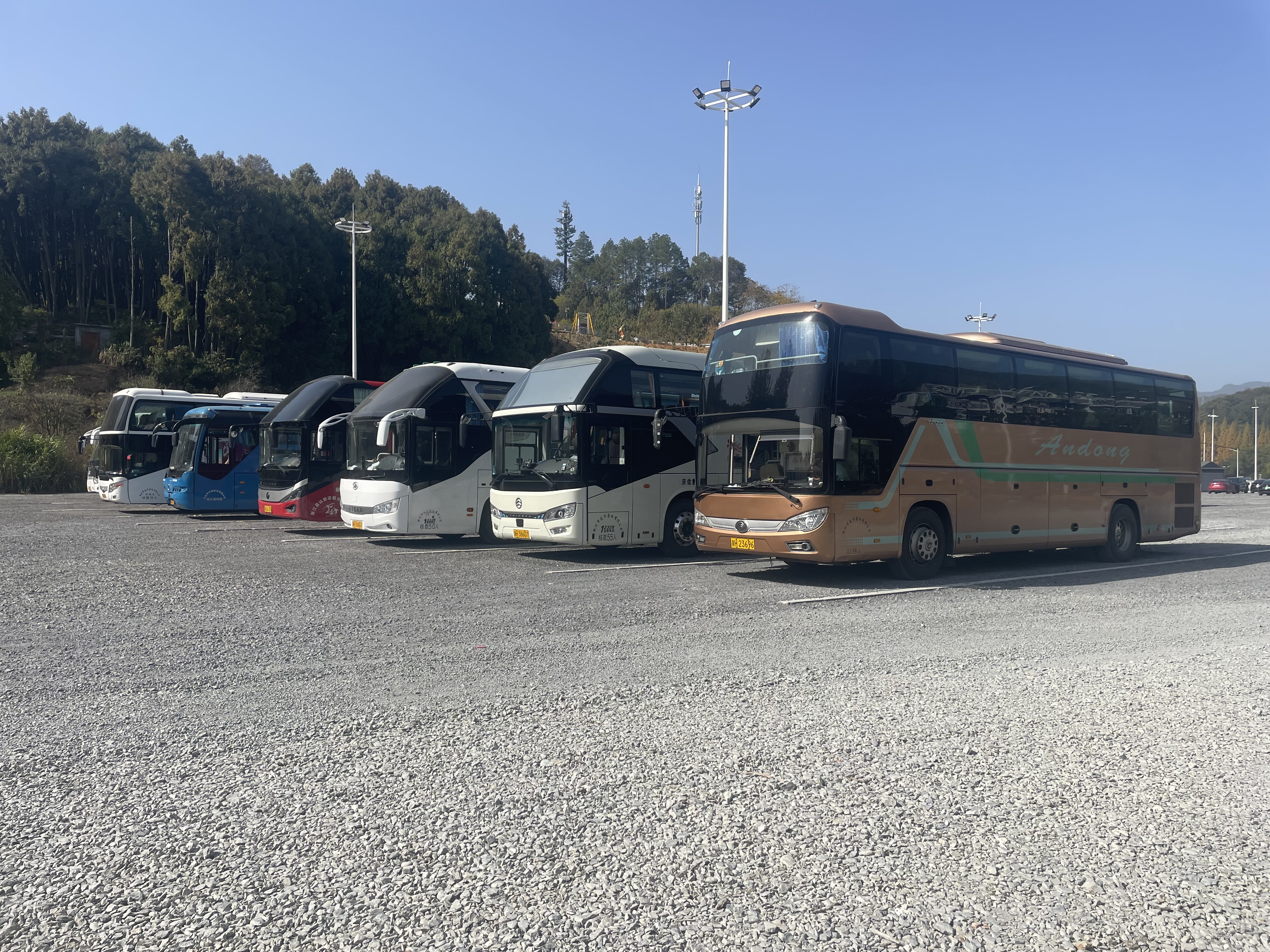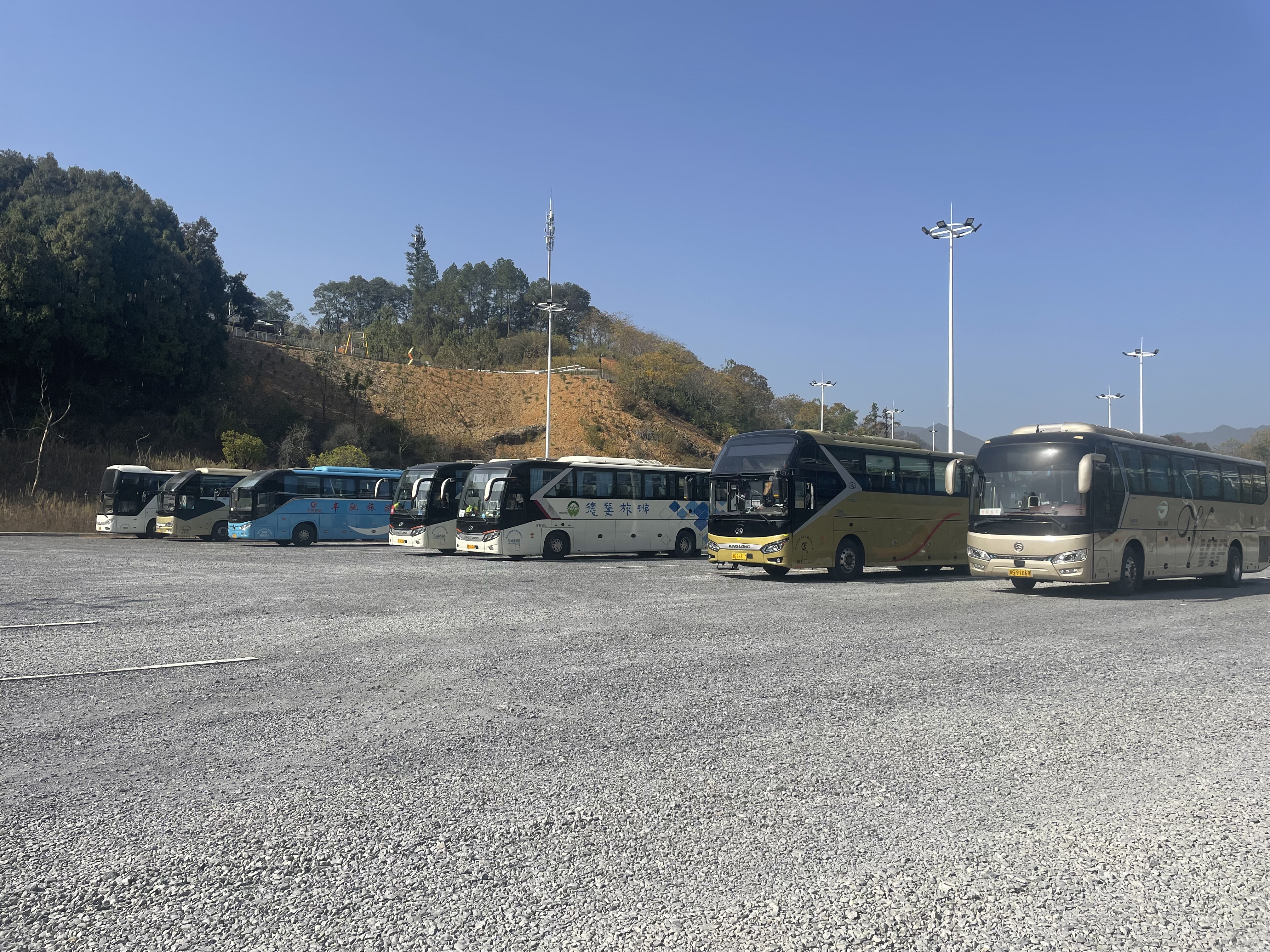 在根宫佛国文化旅游区配套停车场内,十余辆旅游大巴整齐划一地停靠在指定区域,车身排列笔直、间距均匀,与周边开阔整洁的场地环境相得益彰。
