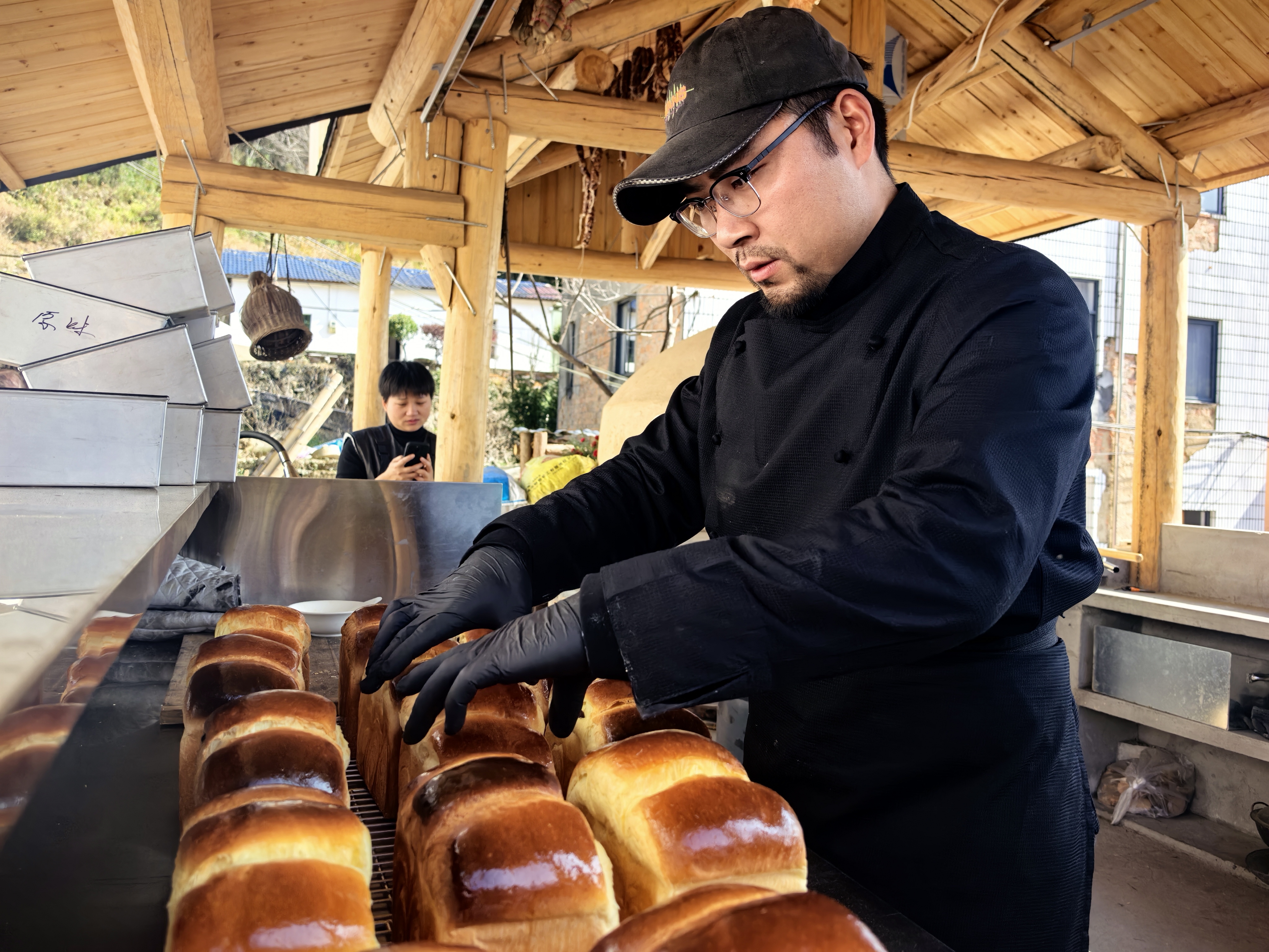 3月10日清晨,开化县芹阳办事处龙潭村蟠桃山深处的“癫仙社”飘出第一缕面包香。窑口边,主理人朱壮状俯身从炉膛取出今天的第一炉吐司。一年前,他还是杭州一家互联网大厂的UI设计师,如今,这个江苏小伙成了这座山里唯一的窑烤面包师傅。