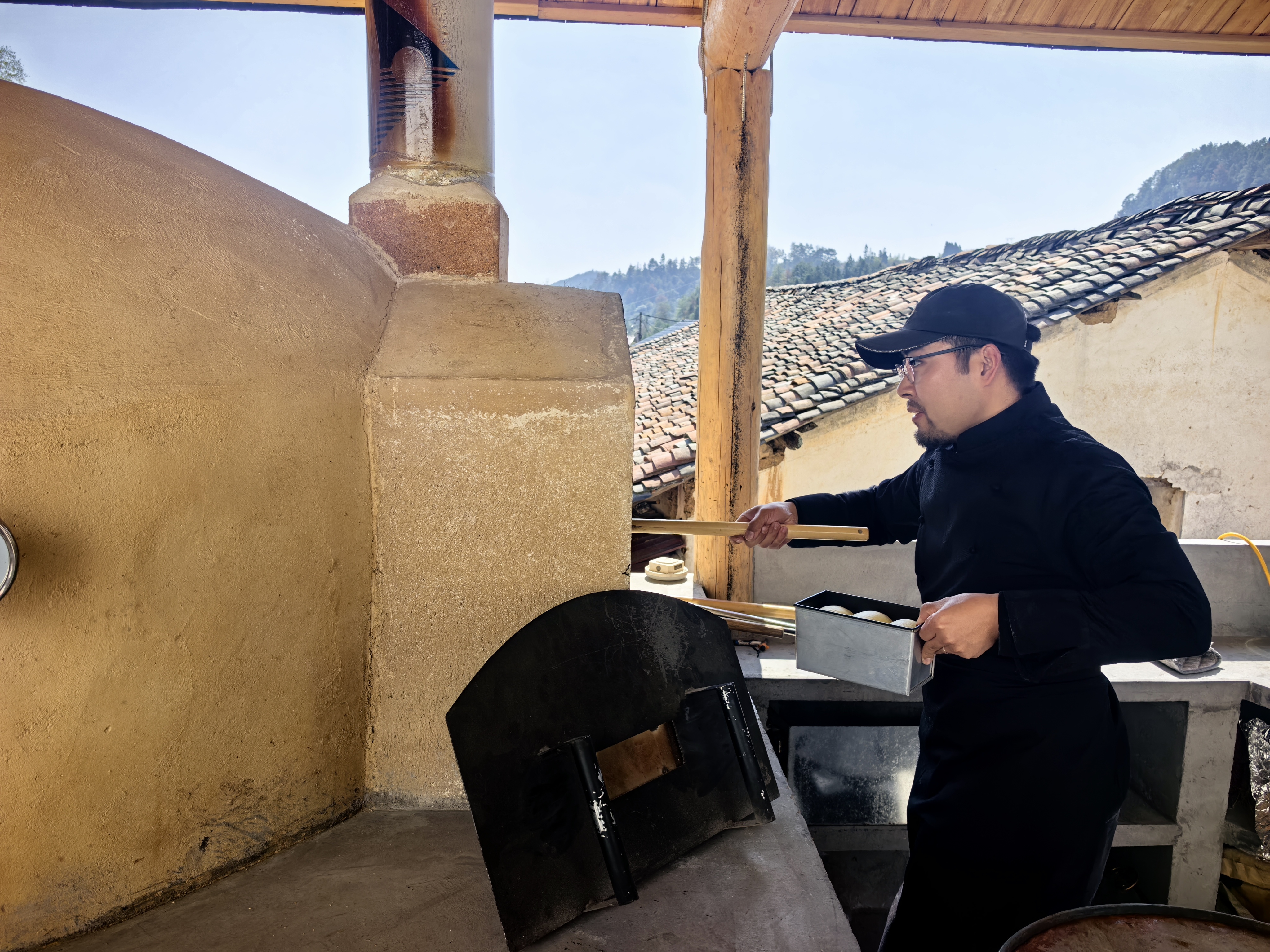 院子里最显眼的是那座面包窑。朱壮状说,面粉是进口的,鸡蛋是挨家挨户从村民那里收来的土鸡蛋,和面用的是山泉水。窑炉是妻子设计、自己亲手砌成,烧柴、控温全靠手感。面包在300摄氏度的窑膛里烘烤二十分钟,外脆内软,成了徒步客下山后的念想。而这背后,是他每天近二十个小时、反复打面发面的练习。一天只出两窑,总是供不应求,早早被预订一空。