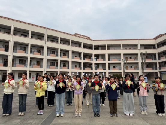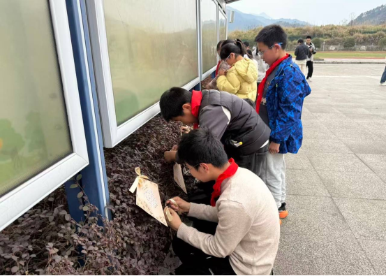 活动现场,学生们先用心熟记待书写的宋词篇章,随后提笔蘸墨,在一张张素雅的飘带上认真书写。一横一竖见功底,一撇一捺寄诗情。当笔墨落定,孩子们在班主任带领下,将写有宋词的飘带轻轻系于校园灌木丛上。微风拂过,一条条墨迹未干的丝绦随风摇曳,仿佛宋词里的词句也在春光中苏醒。师生们共同合影,定格下这一诗意盎然的瞬间。