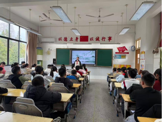 返回班级后,一场精彩的宋词诵读会拉开帷幕。讲台上,学生们全情投入,声情并茂。《清平乐》的婉转缠绵、《如梦令》的细腻感怀,在孩子们天真烂漫的童声中生动再现。朗诵声时而低回婉转,时而清越激昂,纸面上的文字化作立体鲜活的情感,宋词的音韵之美与意境之美,在稚嫩的童音中悄然传承。