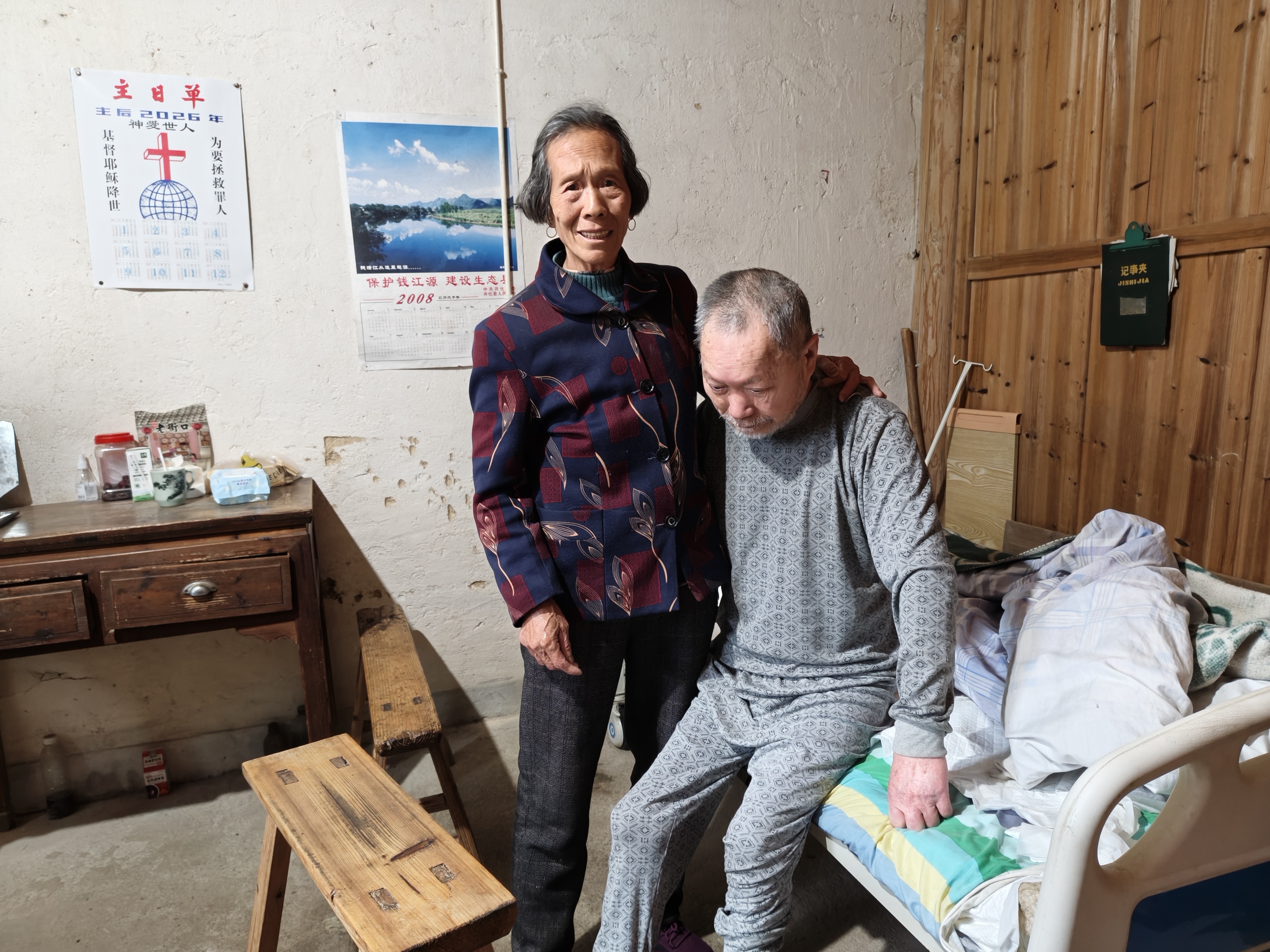4月1日,开化县苏庄镇毛坦村大坂湾自然村的一处院落内,阳光爬上院墙,慢慢照暖院子。卧室内,72岁的詹素文弯下腰,用力扶起瘫痪在床的丈夫,让他靠坐在床边,准备更换衣服。“我和他是再婚家庭,双方子女生活条件都不好,能做的事我自己就做了。”詹素文说,为了不给子女添麻烦,她一人挑起了照顾丈夫姜永德的重担。